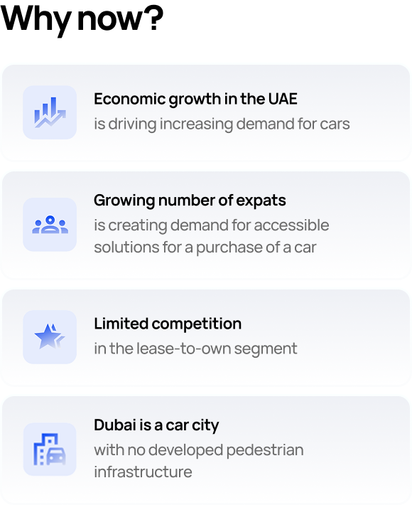 Market opportunity: Filling the gap in car financing for middle and low-income individuals in the UAE market, who cannot obtain loans from banks.