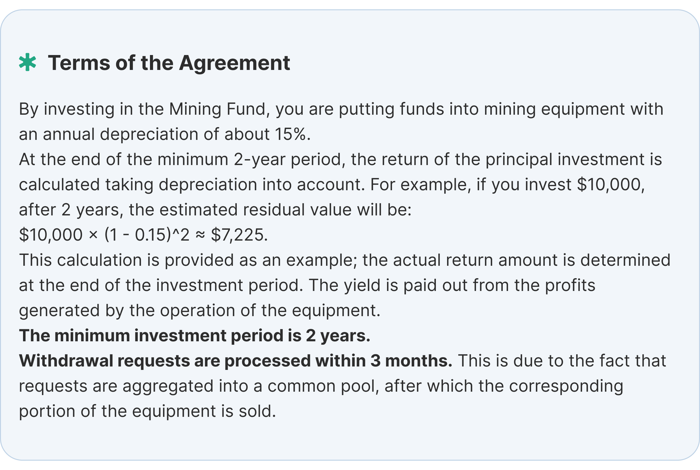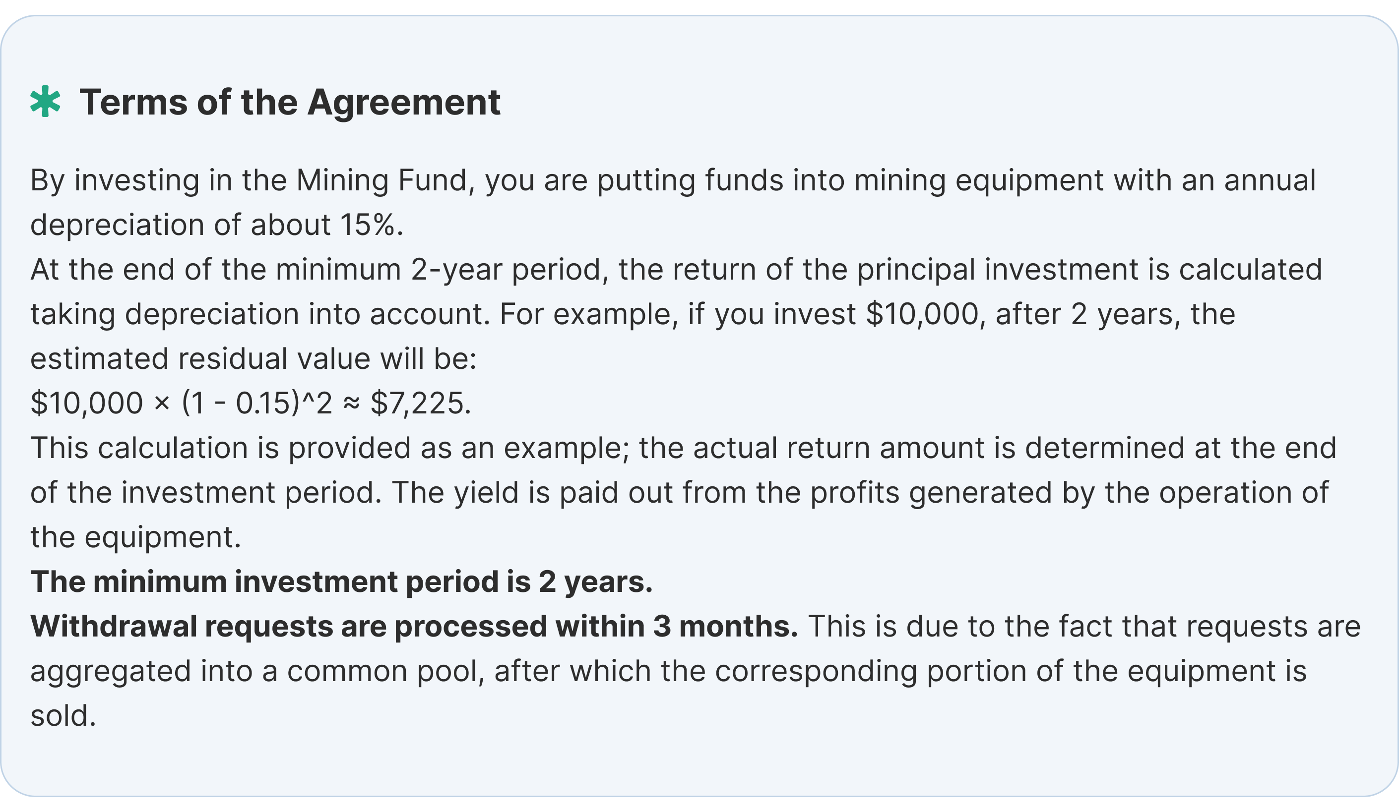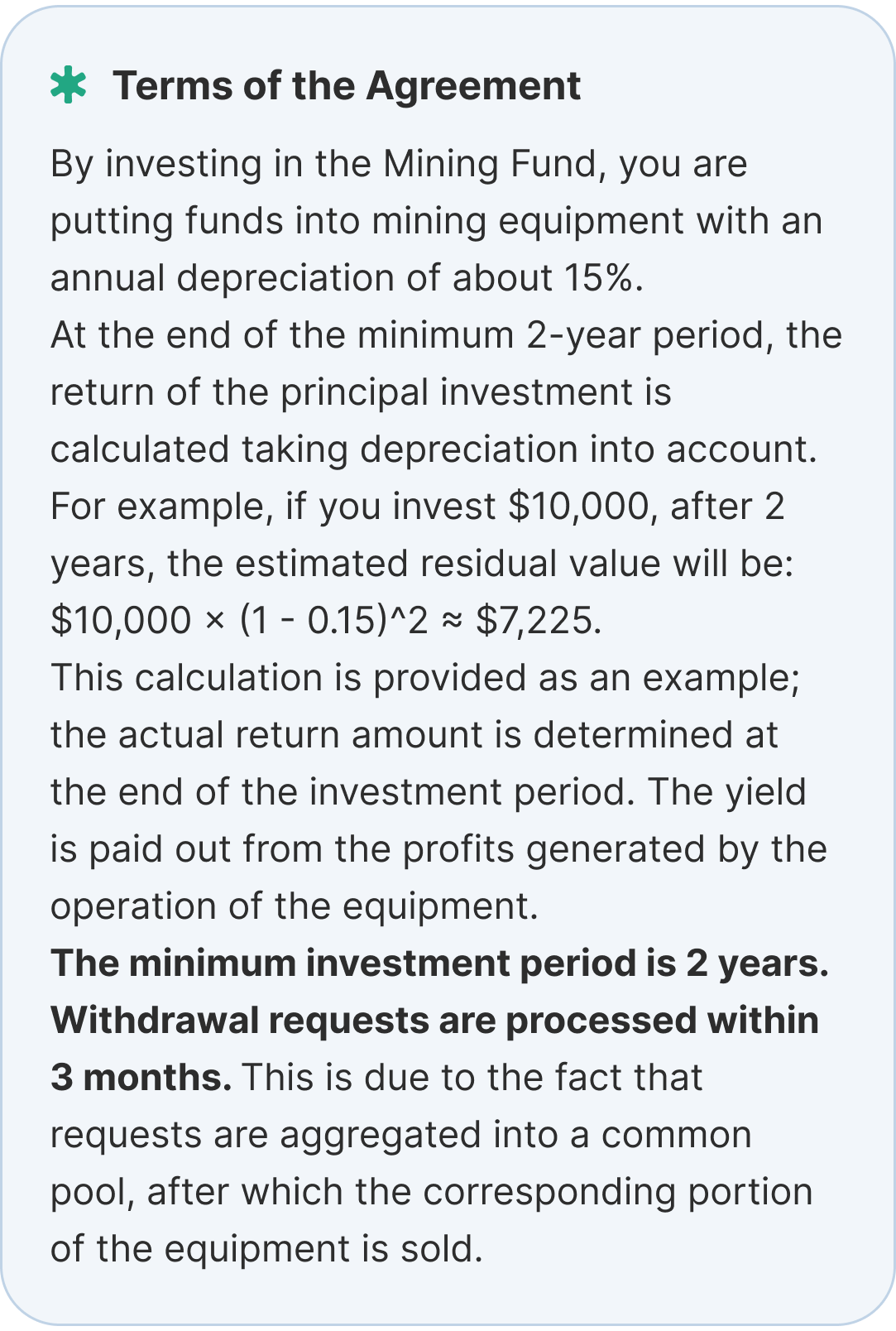 Mining Fund generates revenue through high-performance cryptocurrency mining farms located in the U.S. We negotiate direct electricity contracts with the government to secure energy at favorable rates, further reducing costs and enhancing profitability.