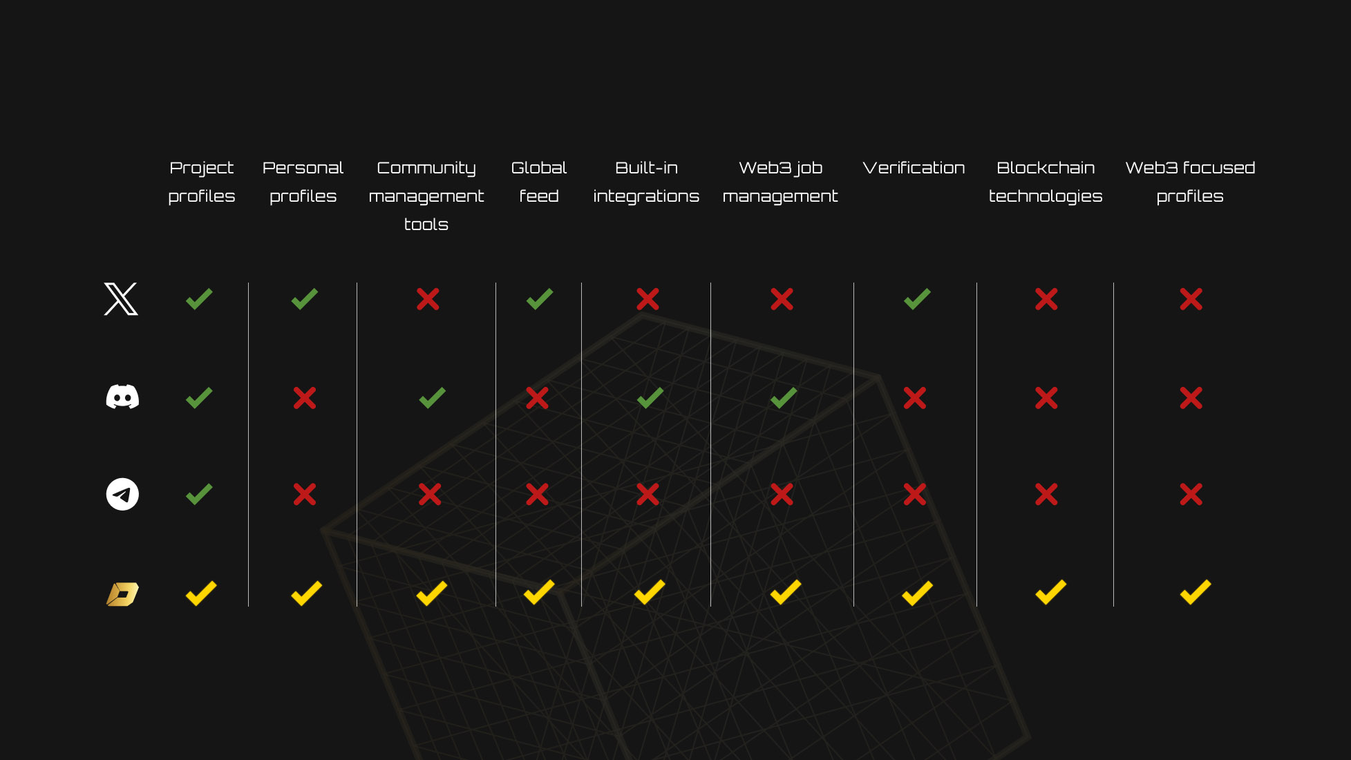 It is impossible to interact in a Web3 space using only one platform. You have no other choice but to constantly switch from one application to another, even within one project. Moreover, the functionality of the current platforms is not adapted to the Web3 environment.