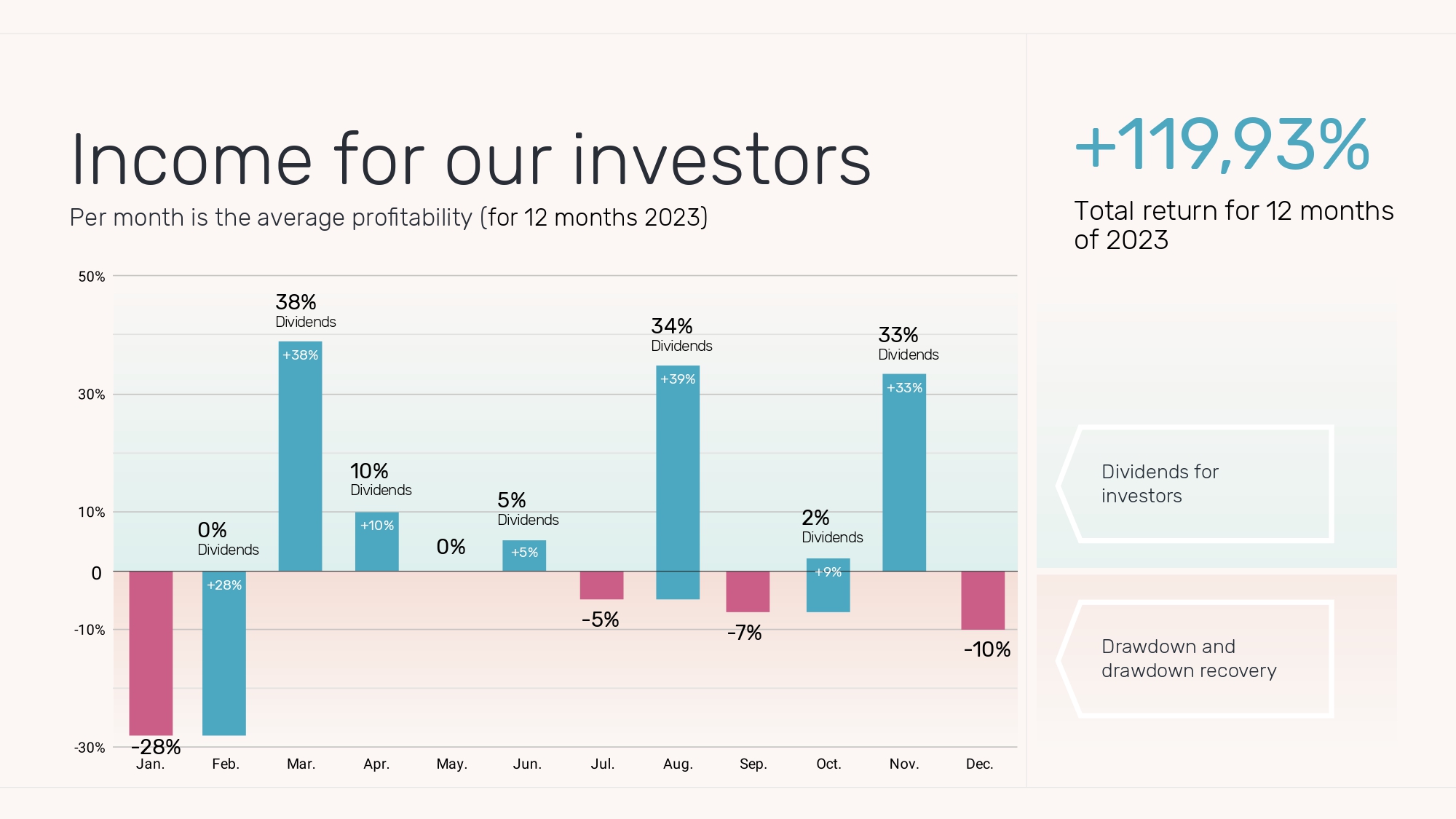 - +39% - August 2023 (Last month's loss of -5% was recovered, +34% dividends)