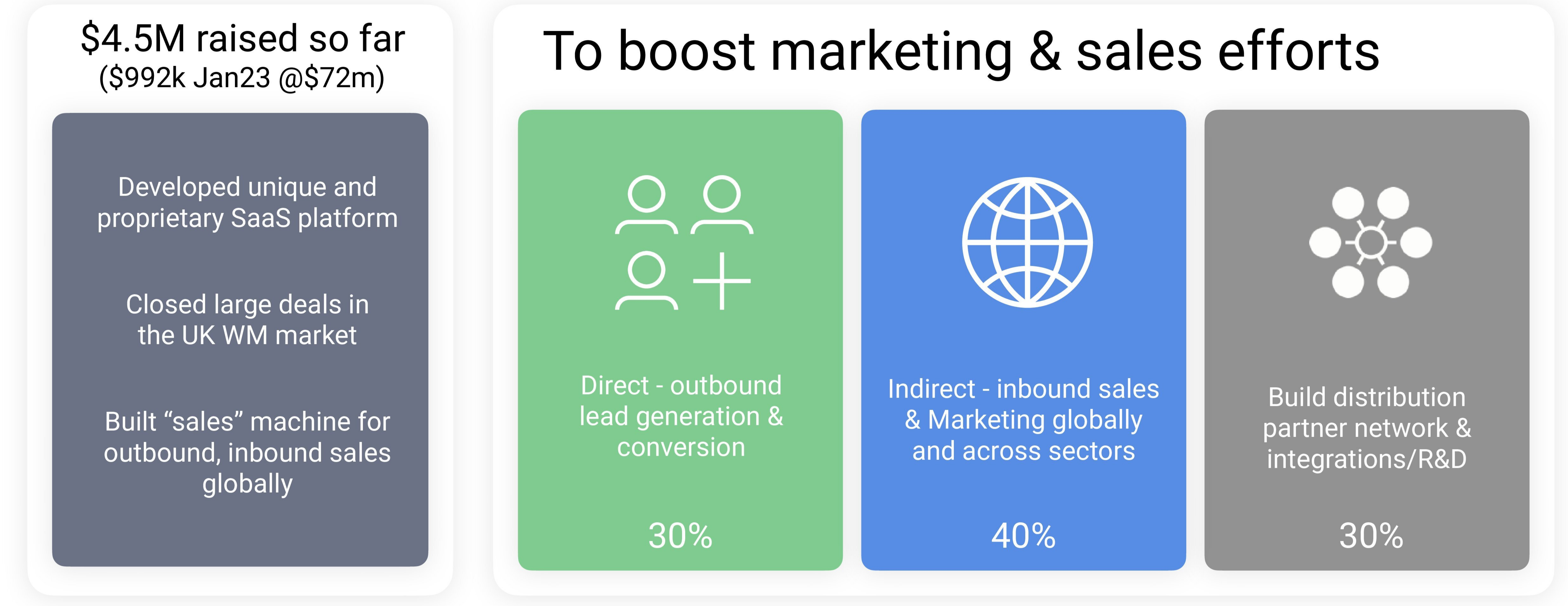 - Circa $1m ARR from sticky or multiple year enterprise contracts. Huge opportunities to increase revenues and volume and capture market share in a high growth 100s billion $ "product" lead market. Raised $4.5m to date. Latest round raised £807k in January 2023 to shift to SaaS S&M model, building the inbound and outbound sales platform & automated platform.