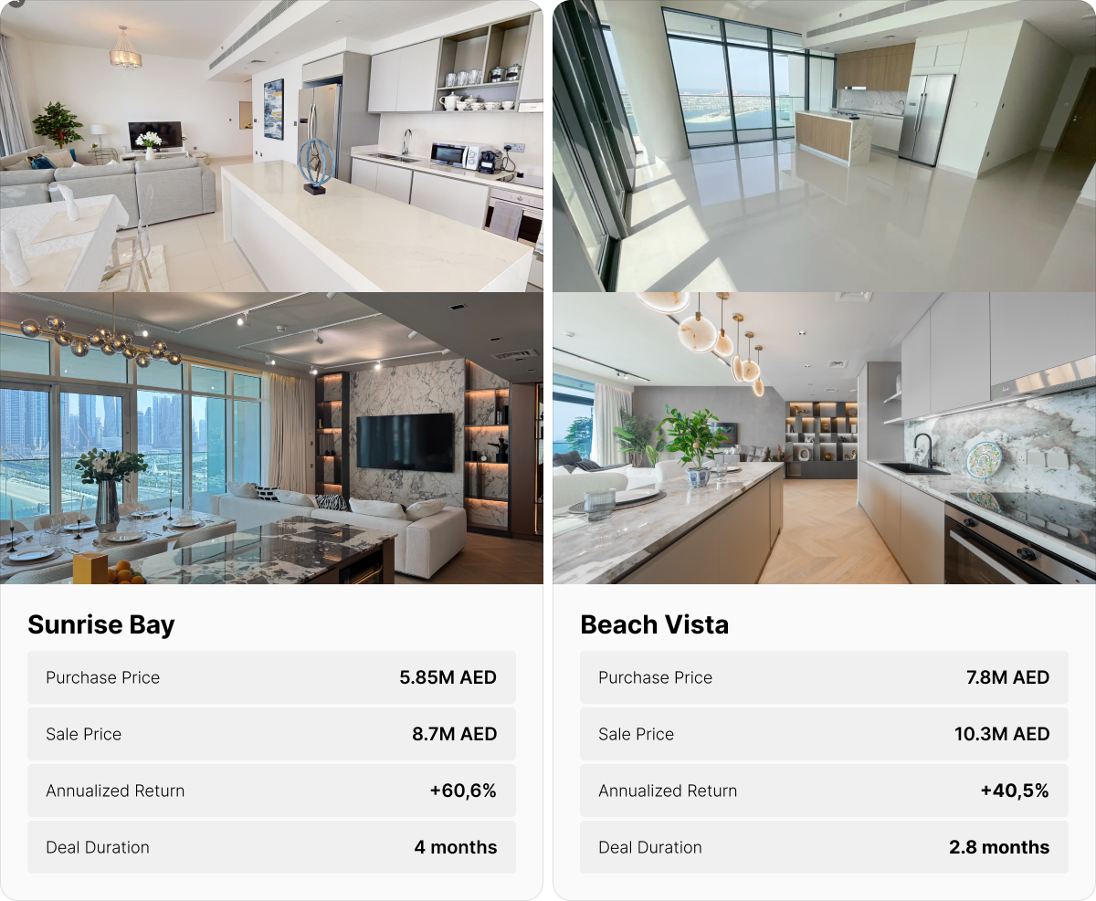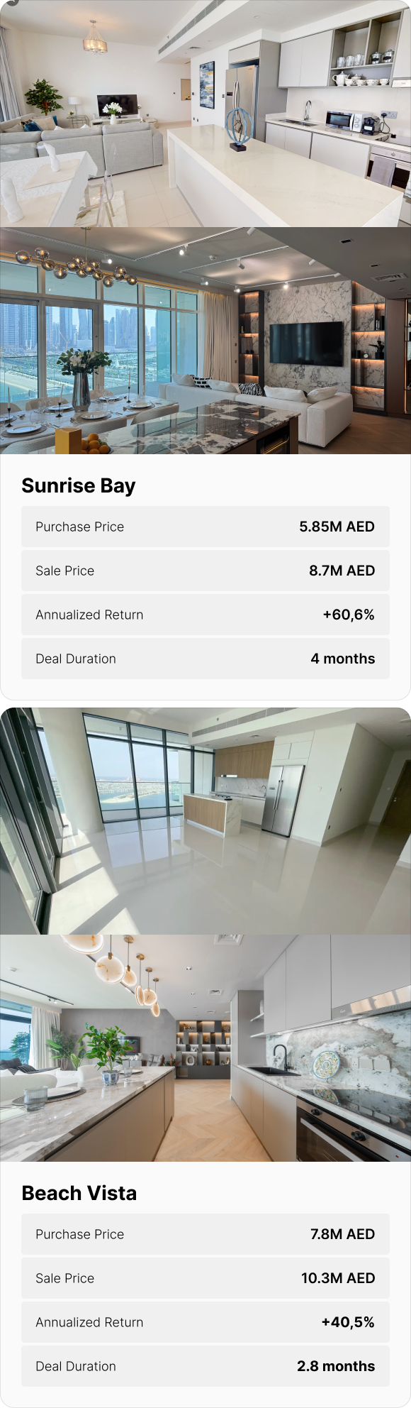 1. Predictable returns. Flipping Fund delivers stable and predictable performance by managing every stage of the investment cycle – from sourcing undervalued properties to professional renovation and selling at the highest achievable market price. We work with highly liquid assets in Dubai’s premium districts and, through precise analytics and an effective sales strategy, provide investors with reliable outcomes.