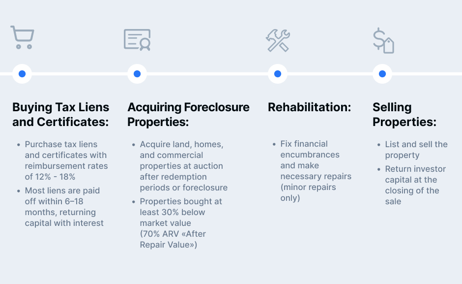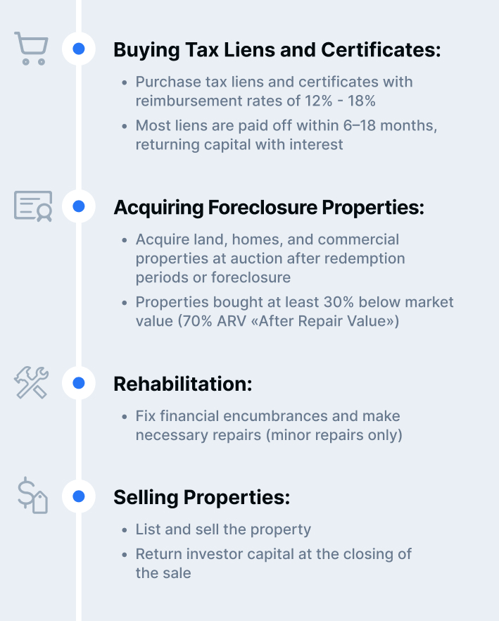 The fund engages in acquiring land, houses, and commercial real estate at post-confiscation auctions, where purchases are made at least 30% below market value, ensuring high potential for value growth through repairs and improvements. Typically, this process takes 6 to 9 months, allowing investors to see the expected profit in the short term.
