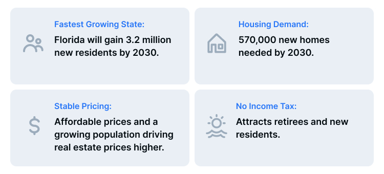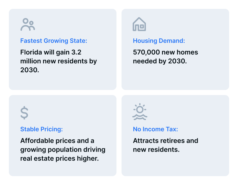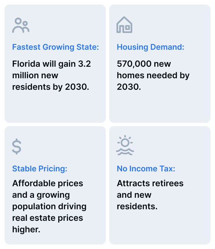 • Fastest Growing State: Florida will gain 3.2 million new residents by 2030