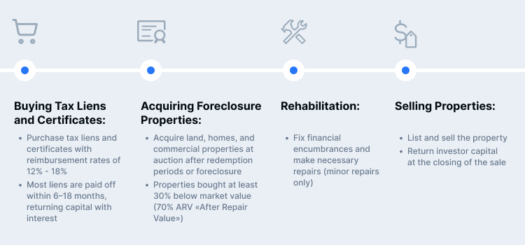 - Purchase tax liens and certificates with reimbursement rates of 12% - 18%