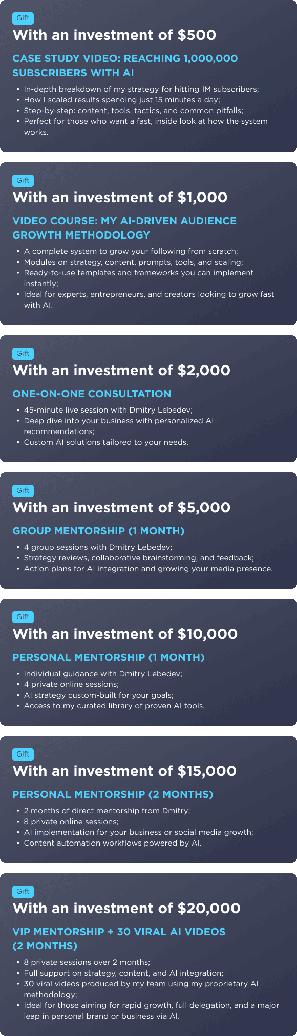 Get consulting from Dmitry Lebed — founder of SkillBranch and author of one of the Top 3 AI-avatar blogs in the CIS (1,000,000+ followers).