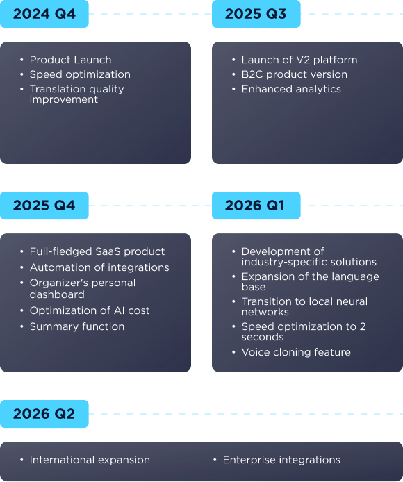 We are now expanding language coverage, optimizing algorithms, and preparing for scale and B2B partnerships. Our next milestone: MRR growth and entry into global enterprise markets.