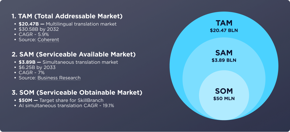The simultaneous translation segment is expected to grow from $3.89 billion to $6.25 billion by 2033 with a CAGR of about 7%, while the AI-driven simultaneous translation market, where SkillBranch operates, is demonstrating record momentum — expanding at an average annual rate of 19.1%.