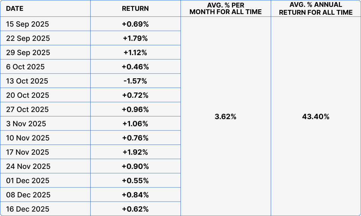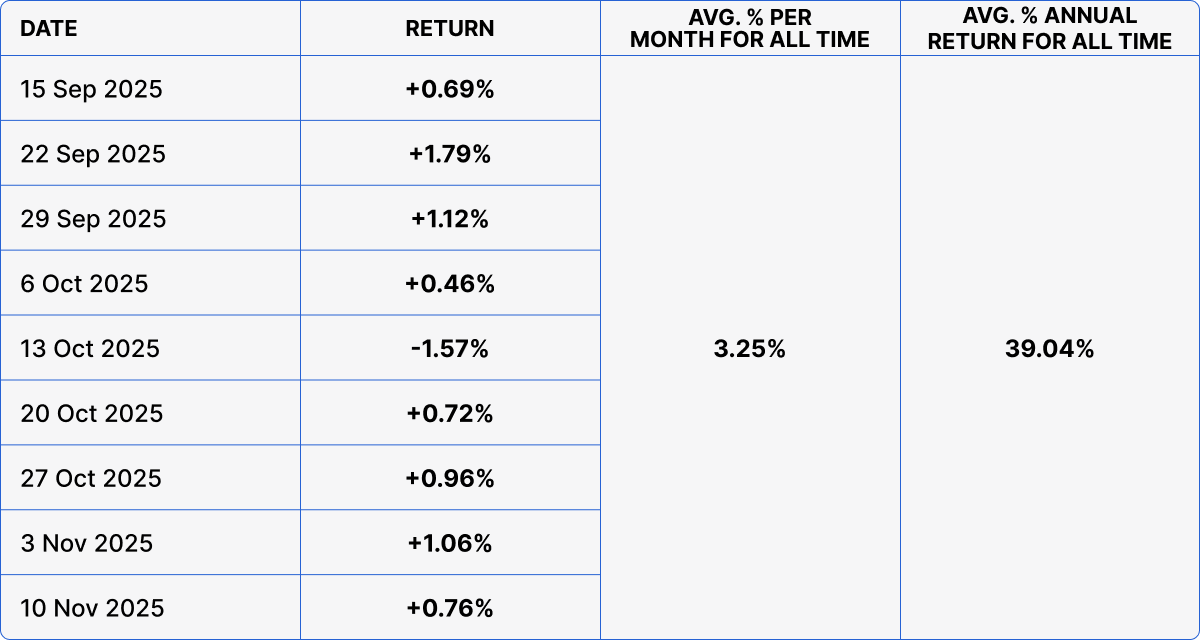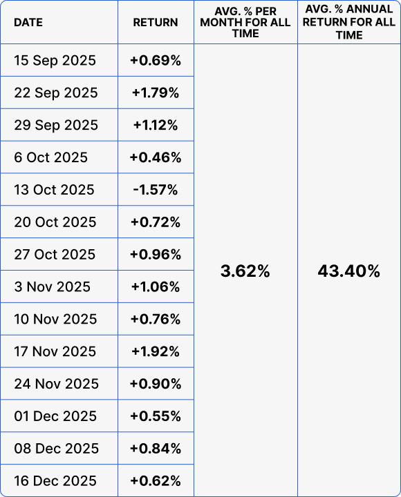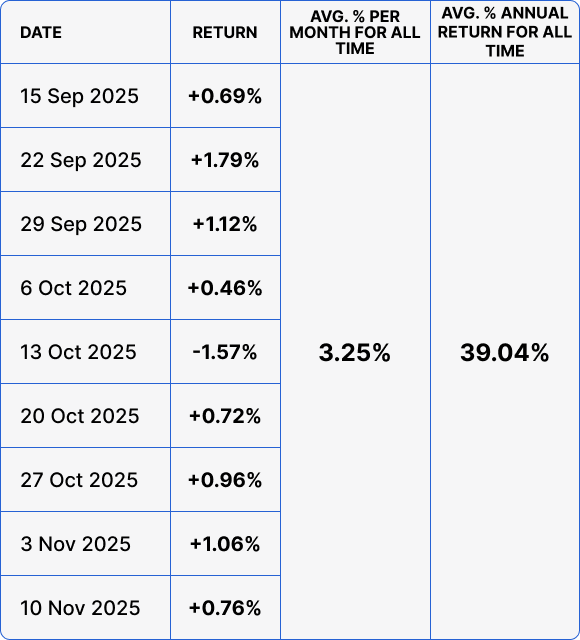 The target return is 6–10% per month. Dividends are distributed weekly, ensuring high liquidity.