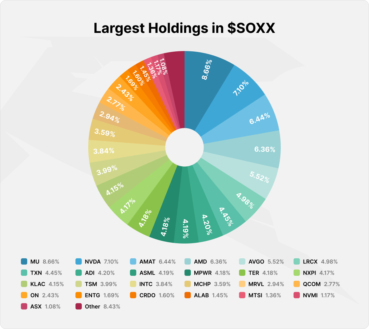 By investing in SOXX, you invest in shares of the largest public semiconductor companies included in the ICE Semiconductor Index. The fund replicates the index structure, following its composition and weightings.