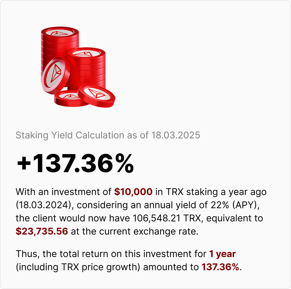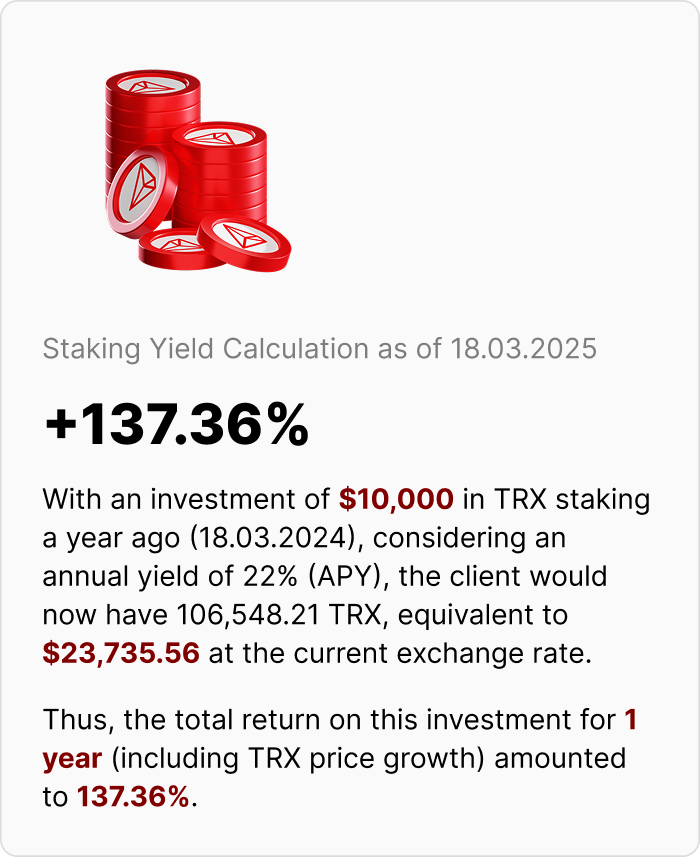 TRX staking is a way to support the TRON network while earning rewards. Your coins remain secure, as they are not transferred to third parties or exposed to hacking risks. Staking is considered one of the most reliable investment methods.