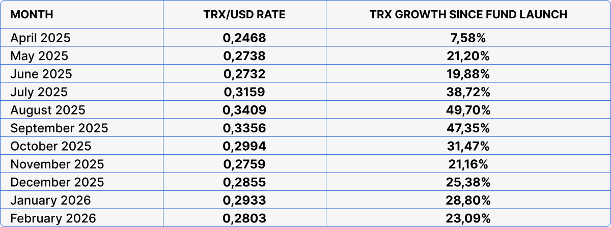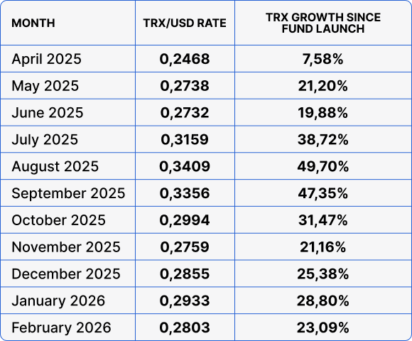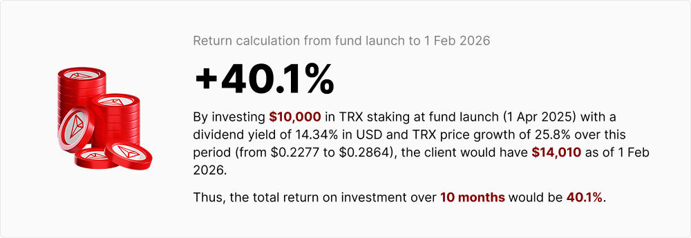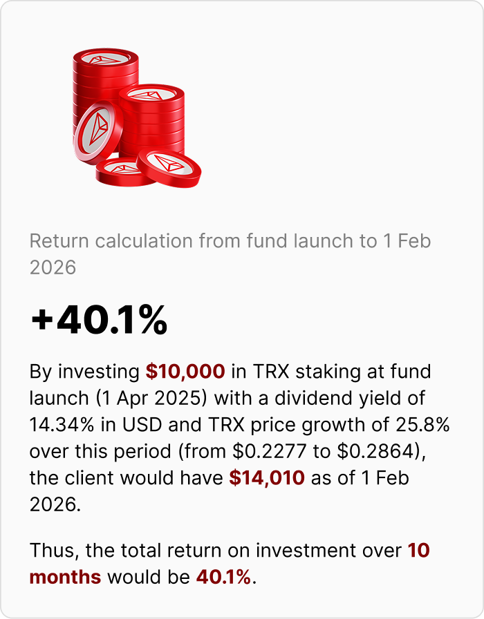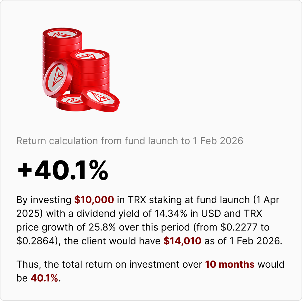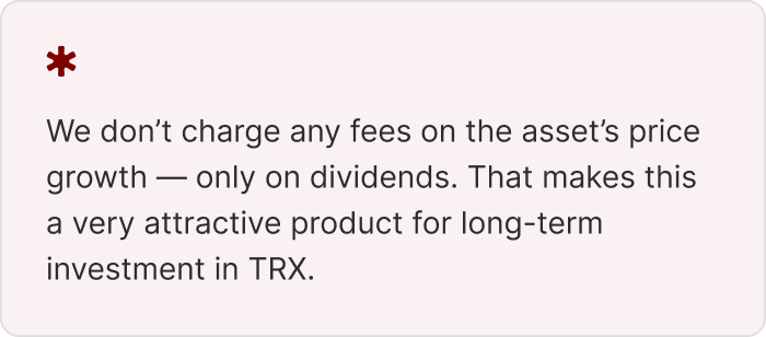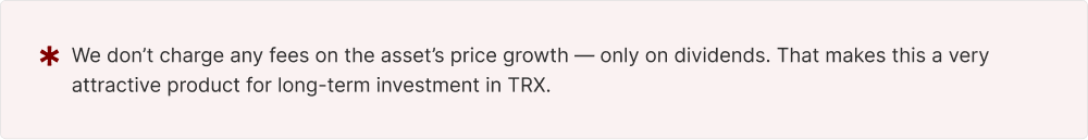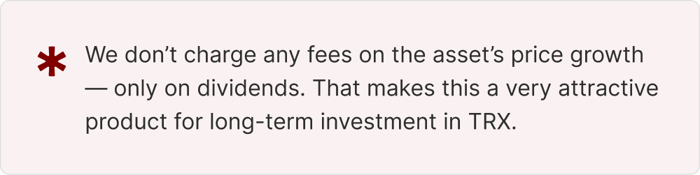 Beyond dividend returns, investors gain exposure to TRX price appreciation. When exiting the fund, tokens are sold at the prevailing market rate – meaning any increase in TRX value over the holding period translates into additional profit. There is no performance fee on TRX price gains.